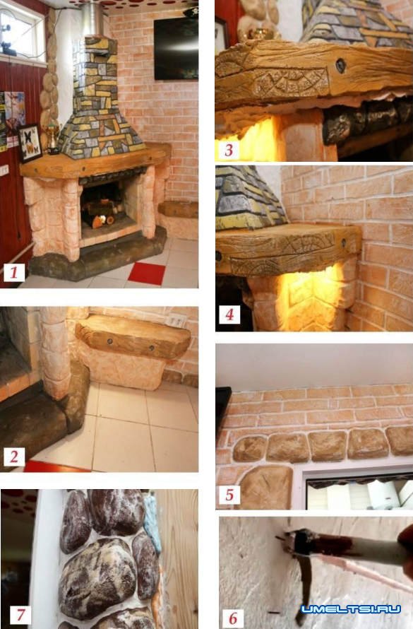 Декорировать дом начал с камина (фото 1) Основание выложил из печных кирпичей. Для облицовки использовал цементный раствор. Развел его в пропорции песка и цемента 3:1. Для пластичности в раствор добавлял немного жидкого мыла (на 25 кг цемента — 70-100 мл мыла). Наносил состав на кирпичи небольшими слоями, формируя мастерком декоративный камень. На нижнем основании выполнил имитацию булыжника (фото 2), на опорах и столешнице металлической щеткой нарисовал линии, как на спиле дерева (фото 3), а на дымоходе вырезал рисунок под каменную кладку. Высушил. Зашкурил неровности и загрунтовал. Расписал акриловыми красками.