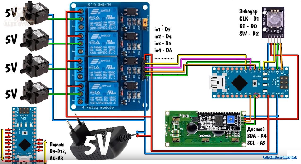 Теперь давайте соберем макет нашего устройства. Подключаем энкодер, как это показано на приведенных схемах, на шину і2с «вешаем» плату дисплея, а затем по порядку сигнальные провода на реле (как в моем случае) или транзисторы. Этот момент очень важен, так как в прошивке Arduino прописывается первый пин подключения помп, а остальные указываются автоматически по их количеству.