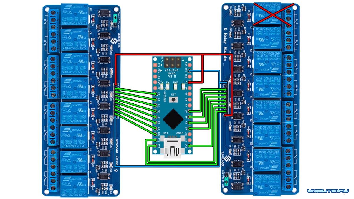 Схема подключения к плате Arduino 14-ти реле, управляющих помпами