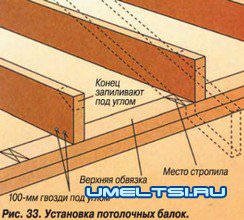 Потолочные балки. Эти горизонтальные детали каркаса крыши (играющие роль затяжек) устанавливают на ребро и прибивают к верхней обвязке стен (рис.33). Обычно потолочные балки перекрывают всю ширину строения. Они лежат на противоположных стенах.