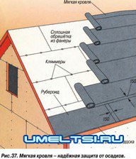 Устройство кровли. Под мягкую кровлю необходима сплошная обрешётка, например, из фанеры. Фанерная обшивка на каркасах стен повышает прочность всего строения и служит отличным основанием для крепления чистовой обшивки. Обычно сначала прибивается, например, пергамин, создающий барьер против ветра и воды.
