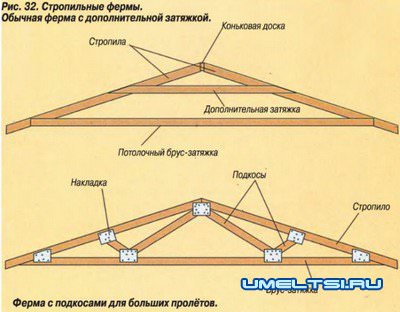Длинные пролёты могут быть связаны затяжками (вставка на рис. 35). Затяжки можно устанавливать по одной на каждую пару стропил или через пару.