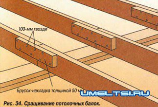 Разметка потолочных балок. С помощью рулетки и угольника разметьте и разложите потолочные балки на верхней обвязке. Заодно разметьте и положение стропил. Если их шаг — одинаковый, расположите стропила и балки впритык друг к другу так, чтобы когда стропила будут установлены, их можно было бы прибить к балкам. Если шаг стропил и балок — разный, например, 600 и 400 мм, расположите их так, чтобы они встречались через каждые 1200 мм. Длинные пролёты планируйте соединять встык с накладками (рис.34).