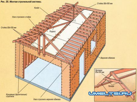 Разметив и выпилив пары стропил, подготовив стойки и коньковую доску, приступают к монтажу стропильной системы. По потолочным балкам настилают доски или листы фанеры в качестве рабочей площадки. Первыми монтируют фронтонные пары стропил со вставками вместо коньковой доски. Их крепят к верхней обвязке и фронтонным стойкам. Затем вместо вставок устанавливают коньковую доску и остальные стропила.
