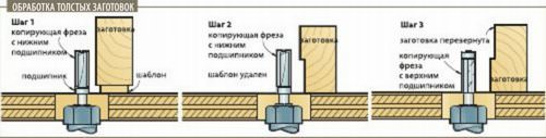 Какую бы фрезу вы ни выбрали, медленно придвиньте к ней заготовку, чтобы кромка шаблона коснулась подшипника, и передвигайте заготовку справа налево, как показано на фото вверху. Если на некоторых участках оставлен припуск более 3 мм, удаляйте его за несколько осторожных проходов. Не останавливайте подачу заготовки, чтобы не возникли прижоги. Внимательно осмотрите обработанные поверхности, прежде чем удалить шаблон. Иногда дополнительный проход позволяет сгладить грубые шероховатости. Вставьте лезвие шпателя между шаблоном и заготовкой, разделите их и удалите скотч. Если толщина заготовки превышает длину лезвий фрезы, используйте фрезы обоих типов в последовательности, показанной на рисунке внизу. Сначала сделайте один проход фрезой с нижним подшипником, положив заготовку шаблоном вниз. Снимите шаблон и сделайте еще один проход, чтобы подшипник катился по уже обработанной поверхности. Наконец, переверните заготовку и установите фрезу с верхним подшипником, который также будет опираться на обработанную поверхность.