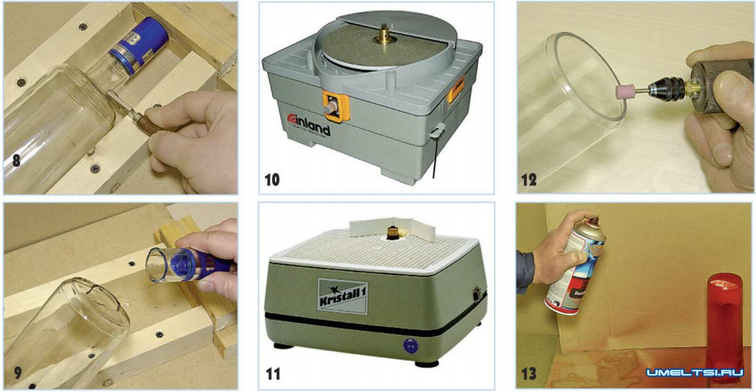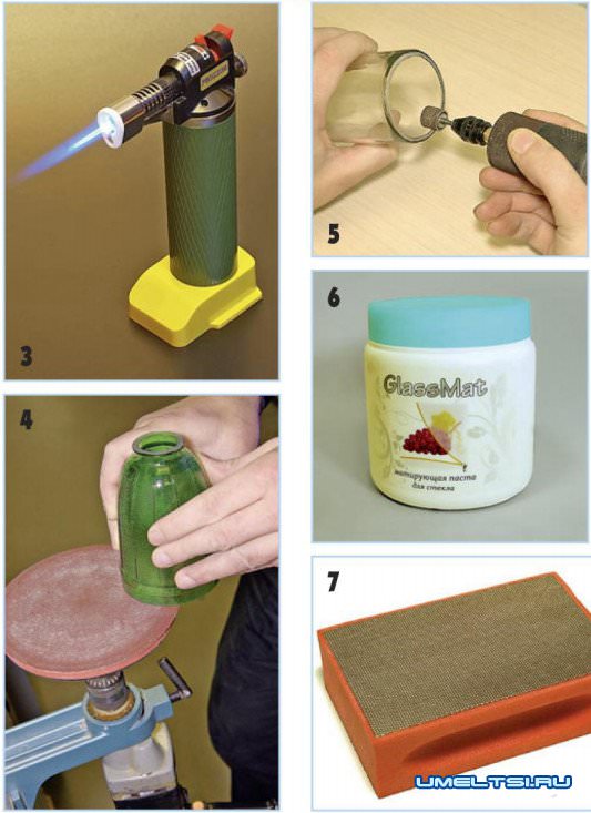 Для этого потребуются: стеклорез (фото 2), газовая мини-горелка (фото 3) (но можно обойтись и без неё), шлифовальная насадка на дрель (фото 4), бормашина (фото 5), паста для матирования (фото 6), губка с алмазным покрытием (фото 7).