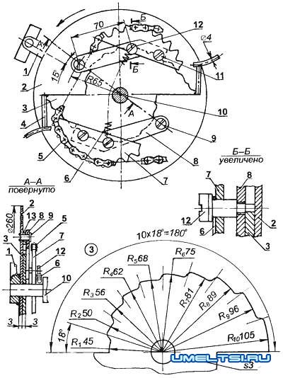 1 - правый шатун; 2 - направляющий диск; 3 - двухлепестковый кулачок; 4 рукоятка разворота кулачка (проволока 04, 2 шт.); 5 - цепь; 6 - нормально сжатая пружина; 7 - зубчатый сектор (от ведущей 28-зубой звездочки детского велосипеда, 2 шт.); 8 - рычаг (2 шт.); 9 - палец крепления рычага к диску (2 шт.); 10 - кареточный вал; 11 - винт крепления сектора к рычагу (2 шт.); 12 - винт крепления сектора к рычагу со штырем (2 шт.); 13 - дистанционная шайба (2 шт.)