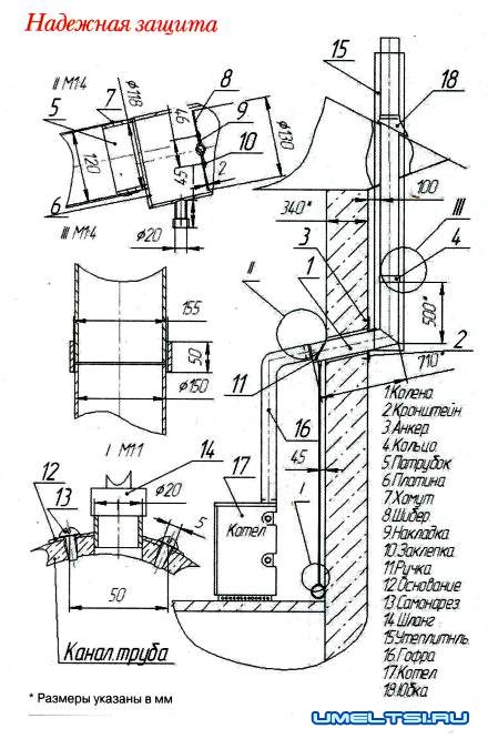 2. В стене котельной продолбил отверстие для колена (см. рис. п. 1). Закрепил в нем трубу кронштейнами (2) и анкерными болтами (3).
