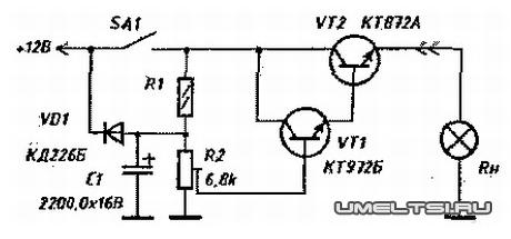 Для продления срока службы ламп накаливания в низковольтной сети и предназначается предлагаемое мною устройство. Время плавного разогрева — выхода лампы на рабочий режим — зависит от сопротивления резистора R1 и емкости конденсатора С1. При указанных на схеме номиналах оно не превышает 2,5 с.