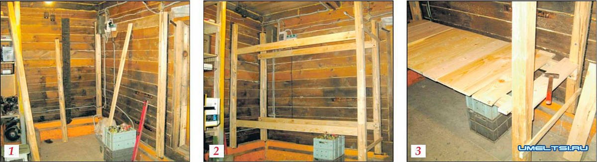 3. Угол стены очистил, удалил розетки и кабели. Подготовленные стойки (жерди) укоротил по месту. Перед креплением трех стоек к стенам (прибивал длинными гвоздями) в этих местах зафиксировал полоски рубероида (фото 1).