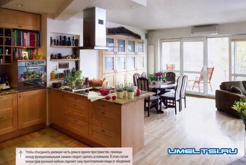 Выбирая проект дома, в первую очередь обращают внимание на размер гостиной. Конечно же, многофункциональное помещение не может быть слишком маленьким. Архитекторы-проектировщики утверждают, что минимальная площадь гостиной в доме должна быть не меньше 20 м-. Опираясь на практический опыт, можно определить минимальные площади других помещений, связанных с гостиной: кухни, служащей для обеспечения всего цикла приготовления пищи (7 м2) и столовой, предназначенной для ее потребления (6 м2). Тем не менее, лишь в редких случаях для каждого из них отводится отдельная комната.
