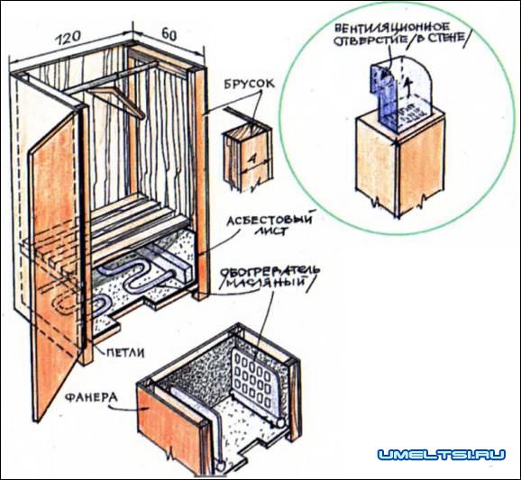 4. В нижней части шкафа оставили зону для установки масляного обогревателя. В целях пожарной безопасности стенки вокруг обогревателя изолировали листом оцинкованного железа. Над обогревателем установили полки из брусков со сквозными отверстиями.