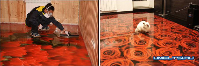 Технология 3D полов весьма сложная и представляет собой полноценный художественный арт-объект. Рисунок наносится на базовую основу, затем покрывается особым полимерным прозрачным покрытием, от толщины которого зависит глубина изображения. Возможно использовать фотографии, природные материалы, специально разработанные объемные изображения, даже можно просто обои. Это позволяет визуально расширять небольшие помещения, реализовать любую фантазию заказчика, использовать это как рекламу, галерею и т.п.