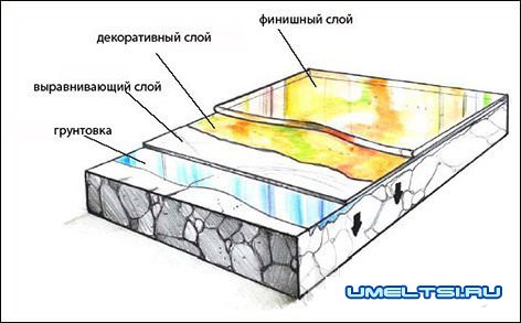 Укладка базового слоя. Правильно выполненная стяжка уже может служить основой для нанесения рисунка. Но лучше добавить специальный полимерный состав, который укладывают по уровню и правилу, полностью выдавливая пузырьки воздуха. Для придания определенной шероховатости добавляют кварцевый песок. Слой должен полностью затвердеть, это как минимум сутки.