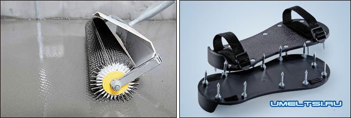 Выравнивающий раствор равномерно распределяют по всей поверхности и обрабатывают специальным игольчатым валиком, чтобы выпустить пузырьки воздуха.