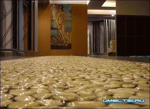 Но если вы и сами неплохой художник, можно попробовать самостоятельно расписать пол вручную. Это не только существенно сэкономит деньги, но и даст простор вашему творчеству. Особенно такой способ нравится любителям хай-тека, ведь он позволяет воплотить любые идеи. А еще можно использовать разноцветный декоративный песок, речную и морскую гальку, ракушки, листья, пуговицы… Словом, творите и самовыражайтесь!