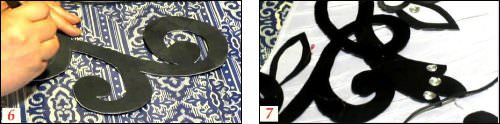 сверху—проутюженный стеганный синтепон и приглаживаем его утюгом. На изнаночной стороне полученной заготовки раскладываем бумажные выкройки ажурных завитков и цветочных лепестков (фото 5).фиксируем портновскими булавками. Обводим узоры по контурам мелком или кусочком мыла. Выжигаем их по этим линиям специальным аппаратом (фото 6). Склеиваем детали между собой термопистолетом, согласно эскизу — получаем накладку-декор. Прилеиваем на него стеклянные стразы (фото 7). Примеряем ажурную часть изделия на жесткую основу и приклеиваем к ней с помощью термопистолета (или крепим по-другому чтобы декор можно было менять).