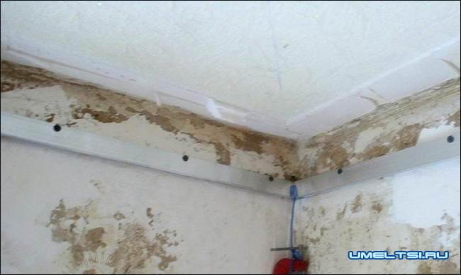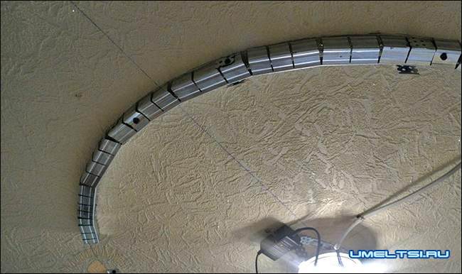 Освещение готово, пора приступать к установки натяжного потолка. Последовательно монтируем профиль за профилем по периметру стен комнаты.