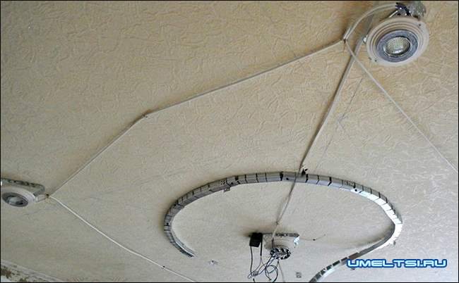 Предварительно, перед тем как начать устанавливать натяжной потолок, при помощи соединительных элементов, следует сделать монтаж проводки, чтобы потом подключить светильники. В нашем случае это пять точечных светильника (один по центру остальные четыре вокруг).