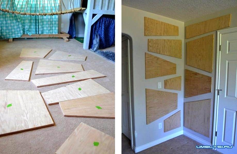 Чтобы прикрепить куски фанеры на стену, необходимо начать с разметки отверстий, на фанере и на стене. Я обвела легкими линиями карандаша все куски фанеры, чтобы потом гарантировано совпали отверстия на стене и фанере.