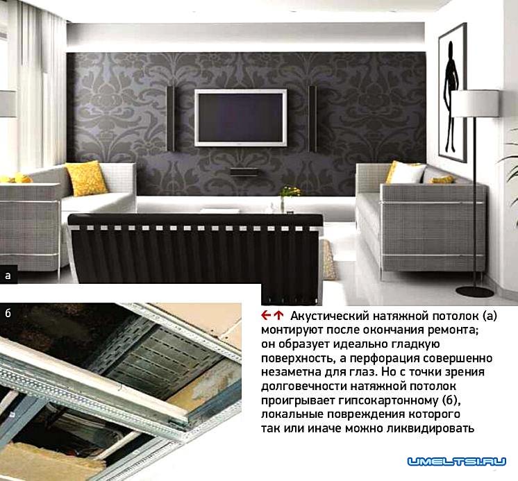 Акустические потолки целесообразно монтировать прежде всего в домашних кинотеатрах и комнатах с музыкальной аппаратурой,сочетая их с аналогичными по свойствам отделочными материалами для стен. Однако подобные конструкции полезны и в некоторых других помещениях, например просторных гостиных или квартирах-студиях с небольшим количеством мебели, где они помогают избавиться от гулкости, сделать звучание речи более разборчивым. Однако далеко не всякий акустический потолок способен улучшить звукоизоляцию комнаты — и той, где он смонтирован, и расположенной этажом выше.