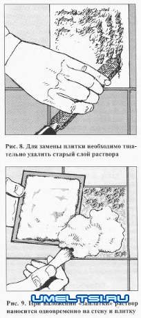Реставрация таких плиток проста. Сначала острым ножом выковыривается замазка из щелей и осторожно вытаскивается плитка. Затем удаляются остатки раствора (8), это место заполняется новым раствором. На замоченную в воде плитку также кладётся раствор и она прикрепляется на место старой (9).