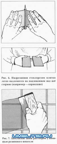 Самую большую сложность представляет обрезка кафельных плиток. Для этого используют специальный резак или стеклорез с линейкой. На плитку накладывается линейка, отмечается линия разреза и затем стеклорезом прорезается кафельная глазурь. Можно несколько раз провести им по плитке, после чего подложить под линию разреза лежащий на столе карандаш: достаточно небольшого усилия, чтобы кафель точно отломился по намеченной линии (6).