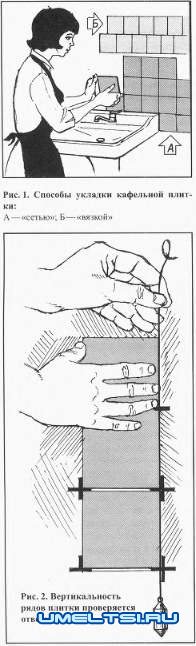 Плитки, уложенные «сетью» (1, А), должны точно располагаться друг под другом, поэтому этот способ требует большого старания и умения. Зато и конечный результат эффективнее. Уложенные «вязкой» (1, Б), ряды смотрятся менее красиво, но зато этот способ позволяет скрыть отдельные ошибки в укладке кафеля, скрыть разницу размеров плит. Нужно стремиться, чтобы ряды кафеля были ровно расположены как в вертикальном, так и в горизонтальном направлении (2).