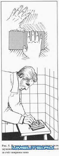 Для этого приготовляется жидкая затирка из 2 частей песка и 1 части цемента, смешанных с водой. Она наносится специальной (7) резиновой полоской (шпателем) на кафельную поверхность, заполняя швы. Для «отбеливания» швов можно использовать белый цемент. После высыхания этого раствора следует приготовить жидкую цементную массу, нанести её на всю поверхность кафеля, затем наполовину влажную массу удалить.