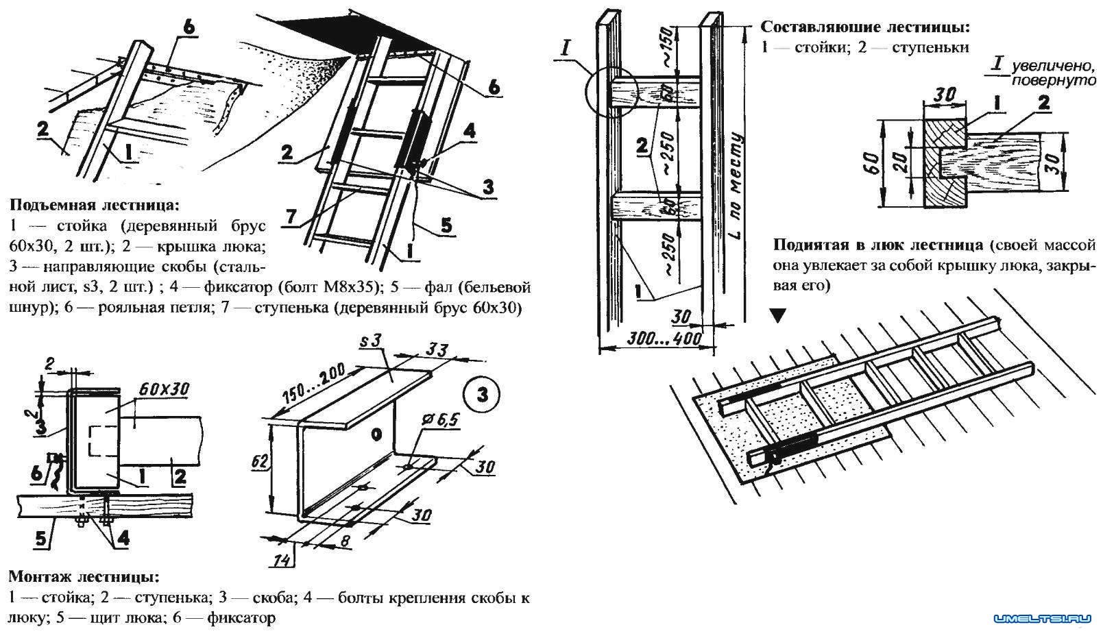 Стойки и ступеньки лестницы выполняются из деревянных брусков сечением 60x30 мм. Длина ступенек 240—340 мм (шаг около 250 мм), количество — по месту, в зависимости от высоты потолка. Соединяются бруски на клею (столярный, казеиновый, ПВА).