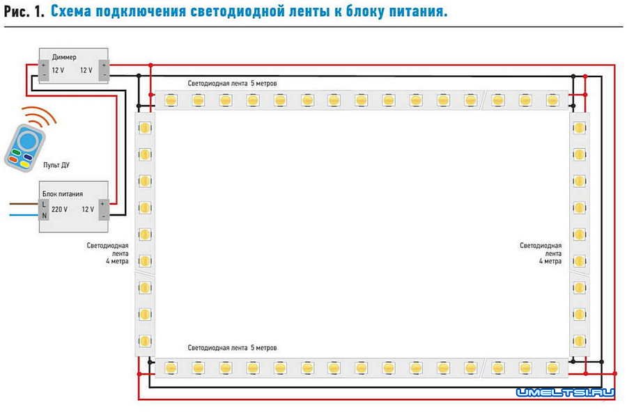 А вот для расчёта мощности блока необходимо знать мощность потребления одного метра ленты и размеры помещения.