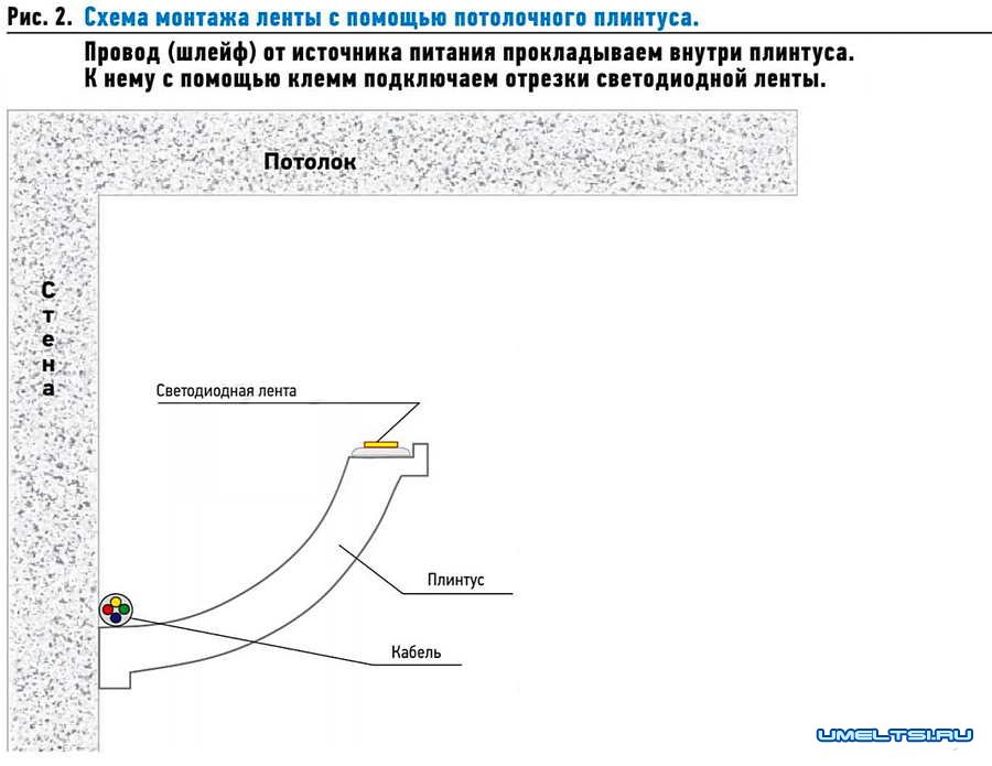 Для установки светодиодных лент есть немало специальных металлических профилей из алюминиевых сплавов. Они бывают с прозрачными пластиковыми крышками и с полочками — для более удобного монтажа. Кроме того что эти профили отводят тепло, они ещё и защищают от пыли. Подсветку также можно монтировать и к потолочному плинтусу (рис. 2).
