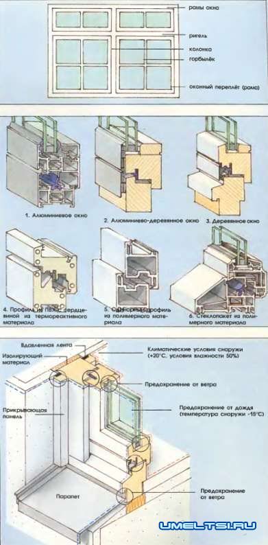 Третьим элементом являются колонки, которые делят ширину оконной рамы и ригель, делящий высоту оконной рамы (когда-то называемый горизонтальным импостом или средником). Ещё имеются горбыльки; они делят ширину и высоту оконного переплёта и делают возможным закрепление стёкол. Выбирая вид окна, инвестор должен поставить себе вопрос, из какого материала они должны быть изготовлены - из дерева, пластика или металла. Разница в качестве не очень большая - это касается также старых деревянных окон, которых на рынке около 40%. Обычно эти окна сделаны из отечественных сортов дерева - сосны, ели, пихты, лиственницы или дуба, часто дополненные элементами дерева субтропических лесов. Для лучшего использования материала профили деревянных окон часто имеют форму плиток.