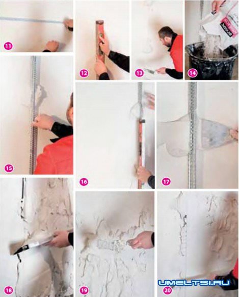 Маяки устанавливаем на «островки» (13) гипсовой штукатурки«Боларс Гипс-Комфорт» или используем «Боларс Алебастр» (14). Последний предпочтительнее, если требуется быстрое схватывание. Выставляем маяки, также ориентируясь по линиям (15). Корректируем их расположение по вертикали и горизонтали с помощью уровня (16). Затем сглаживаем неровности самих маяков (17). Снова замешиваем раствор «Боларс Гипс-Комфорт», набрасываем его сверху вниз и выравниваем правилом снизу вверх (18). Продолжаем, заполняя пустоты (19) и вновь разравнивая штукатурный слой правилом (20).