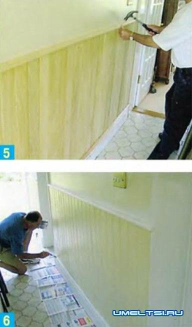Если вы обшиваете стену примерно до половины высоты помещения, достаточно трёх брусков. Нижний брусок надо прикрепить у пола, а верхний — чуть ниже верхнего конца доски обшивки. Нижний край доски обшивки должен отступать от пола на 20-30 мм. Позже этот зазор будет закрыт плинтусом. Если стена неровная, бруски придётся подогнать, чтобы их внешние кромки лежали в одной плоскости.
