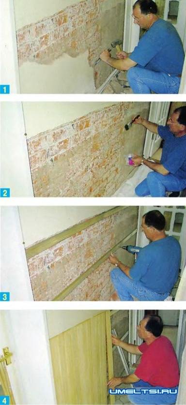 К каменным стенам предварительно с помощью дюбелей крепят бруски, к которым и прибивают доски обшивки. Если каменная стена была оштукатурена, то надо сбить слой старой штукатурки и очистить кирпичи от остатков застывшего раствора (фото 1). Затем стену желательно покрыть грунтовочным антисептическим составом на основе эмульсии ПВА (фото 2).