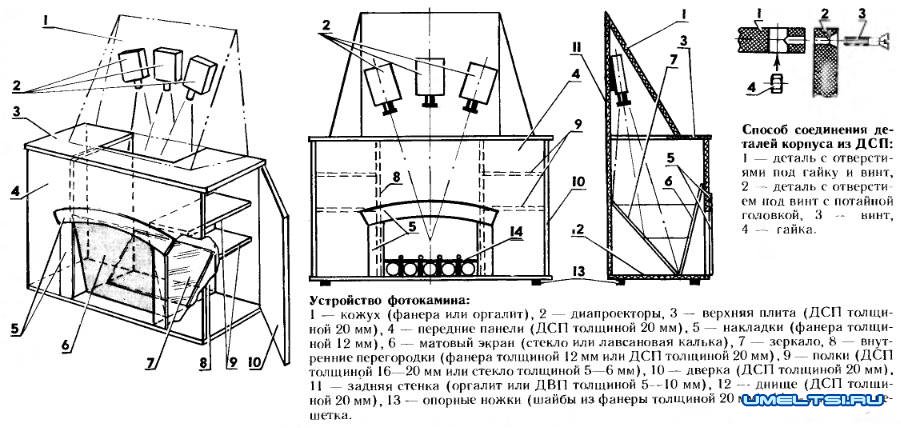 Взгляните на наши рисунки. Как видите, внутри камина располагается матовый экран, и на него с помощью нескольких фильмоскопов проецируется изображение горящего костра.