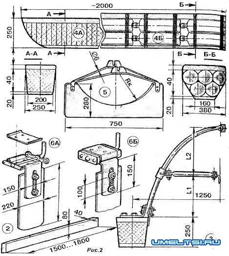 Самый ответственный узел - металлическая рама. Образуется она из кронштейнов и растяжек. Выполнить их лучше из стальных труб диаметром 28...30 мм. Лучшее решение - соединить детали сваркой. Если же с ней возникнут проблемы, то можно использовать элементы болтового соединения, показанные на рисунке 2. Размеры L1 и L2 определяются из расчетов вашего роста, длины ног и размеров велосипеда. К поплавкам рама крепится на подпятниках с помощью мощных саморезов с болтовыми головками. А вот к раме самого велосипеда вся конструкция присоединяется: сверху к деревянным балкам - с помощью четырех болтов М10 и к осям передних и задних колес -гайками М8. Движитель системы Энкерта - идеальный с опущенными вниз лопастями, способ их крепления и все необходимые размеры вы найдете на рисунках.