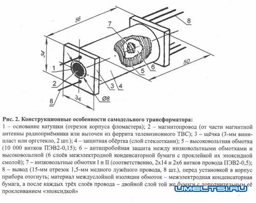 В корпусе между трансформатором и умножителем, а также у электродов со стороны пайки необходимы перегородки из достаточно прочной пластмассы - как мера по укреплению конструкции в целом и предосторожность, позволяющая избежать проскакивания искры с одного радиоэлемента монтажа на другой, а также как средство предохранения самого трансформатора от пробоев. С наружной части под электродами крепятся усы из латуни для уменьшения расстояния между электродами, что облегчает образование защитного разряда.