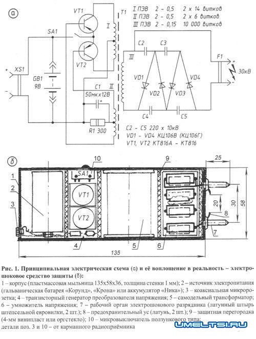 Нелишне, думается, предупредить радиолюбителей о необходимости осторожного обращения с защитным ЭШУ как в период конструирования и наладки, так и при хождении с готовым электрошокером своими руками. Помните, что оно направлено против хулигана, преступника. Не превышайте пределов необходимой самообороны!