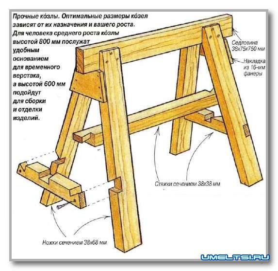 От большинства козел мои отличаются соединениями. Последние, сделанные вполдерева из половин «ласточкиного хвоста» (см. рис.), я подсмотрел у старого плотника из Румынии. Соединение — прочное и не слишком требовательное для выпиливания, особенно в мягкой древесине. Но такое соединение обеспечивает большую прочность, жёсткость и хорошо смотрится. Кроме того, изготовление даёт хорошую практику по разметке и выпиливанию соединений в мягкой древесине, что очень пригодится во время работы с твёрдыми породами древесины.