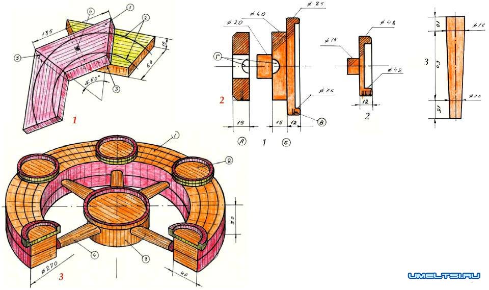 На токарном станке выточил 6 укладок для стаканов (2) и столько же спиц (3).