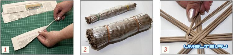 С помощью спицы скручиваем необходимое количество трубочек. Газетный лист при этом кладем так, чтобы снаружи оставалась только белая часть бумаги (фото 1). Подготовленный материал опускаем на КЗ-15 секунд в емкость с морилкой Палисандр, разведенной водой1:2 или 1:3 (это позволит получить цвет, максимально напоминающий натуральную лозу). Затем раскладываем заготовки на клеенке и сушим в течение 24 часов.