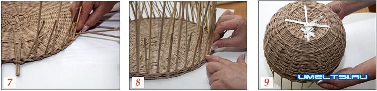 Диаметр подноса должен получиться на 3-4 см больше будущей крышки — хлебница будет легко закрываться (фото 6) Достигнув нужной величины донышка, поднимаем стоячки вверх, начиная с отмеченного. Под него подкладываем дополнительно 2 трубочки, чтобы легче было зафиксировать последнюю стойку. Плотно прижимая к основанию, поднимаем все стойки вверх (фото 7). Затем выплетаем стенки подноса на высоту примерно 3-4 см, начиная каждый ряд с помеченной трубочки.