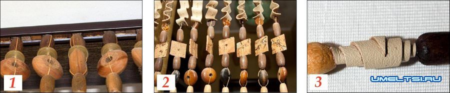 2. Нанизывала декоративные элементы в произвольном порядке, фиксируя каждую деталь двойным витком шнура. При этом следила, чтобы ряды одинаковых деталей располагались на одном уровне по горизонтали (фото 2). Дойдя до нужной длины, обрезала 11 центральных нитей, чтобы можно было проходить в двери, не задевая штору.