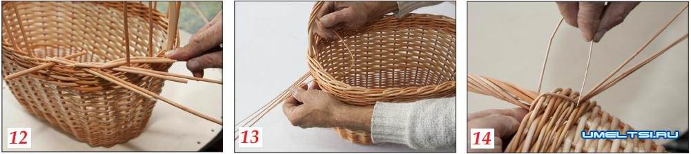 Необходимо настроиться на работу и плести все сразу до конца, иначе прутики начнут подсыхать, а все изделие целиком не замочишь, так как лоза из-за дубильных веществ потемнеет и разница с новыми прутками будет видна.