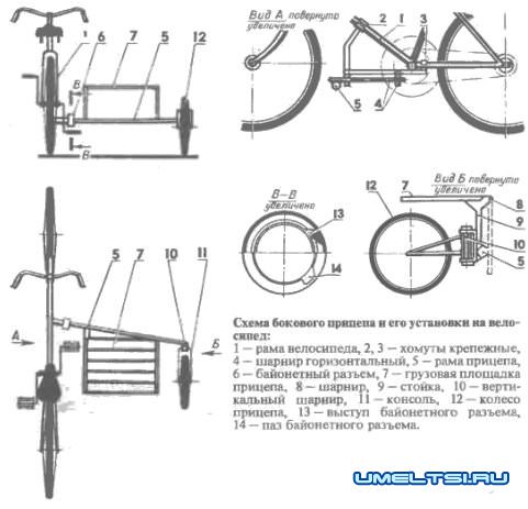 К раме велосипеда прицеп крепится двумя хомутами (поз. 2 и 3 на рисунке). Горизонтальный шарнир в плоскости симметрии велосипеда обеспечивает возможность наклона на виражах и «качание» прицепа на неровностях дороги. Взаимные угловые перемещения облегчаются поворотом самоустанавливающегося нолеса вокруг вертикального шарнира.