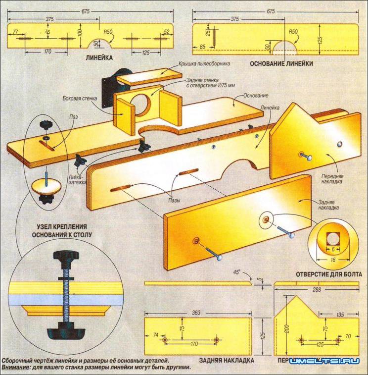 Все детали линейки делают из 6-мм фанеры карельской березы российского изготовления. Её продают листами 1500x1500 мм. Изготовление линейки начните с выпиливания (по соответствующим вашему станку размерам) самой линейки и её основания. Затем с нижней стороны линейки и передней стороны основания выпилите по полукругу радиусом 50 мм. Центры обоих полукруглых вырезов должны быть расположены на расстоянии 300 мм от правого торца каждой из этих деталей. На расстоянии 85 мм от левого торца основания выпилите поперечный паз 10x58 мм для шпильки крепления основания линейки к столу.