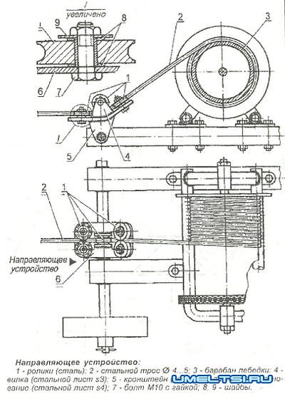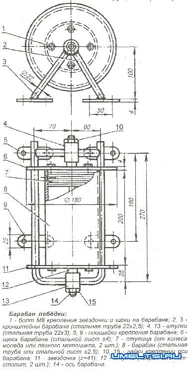 Барабан лебёдки собирается из двух мопедных колёсных ступиц, на которых шестью винтами Мб закрепляется отрезок трубы большого диаметра -готовой или согнутой и сваренной из листа толщиной 3 мм.