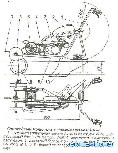 Выход, однако, из этого положения есть. Ничто не мешает объединить мотолебёдку и плуг в единое целое. Правда, это уже будет не универсальный механизм, способный пахать, бороновать, культивировать и служить грузоподъёмным устройством на строительстве дома или при рытье колодца, а просто плуг. Плуг с мотоприводом.